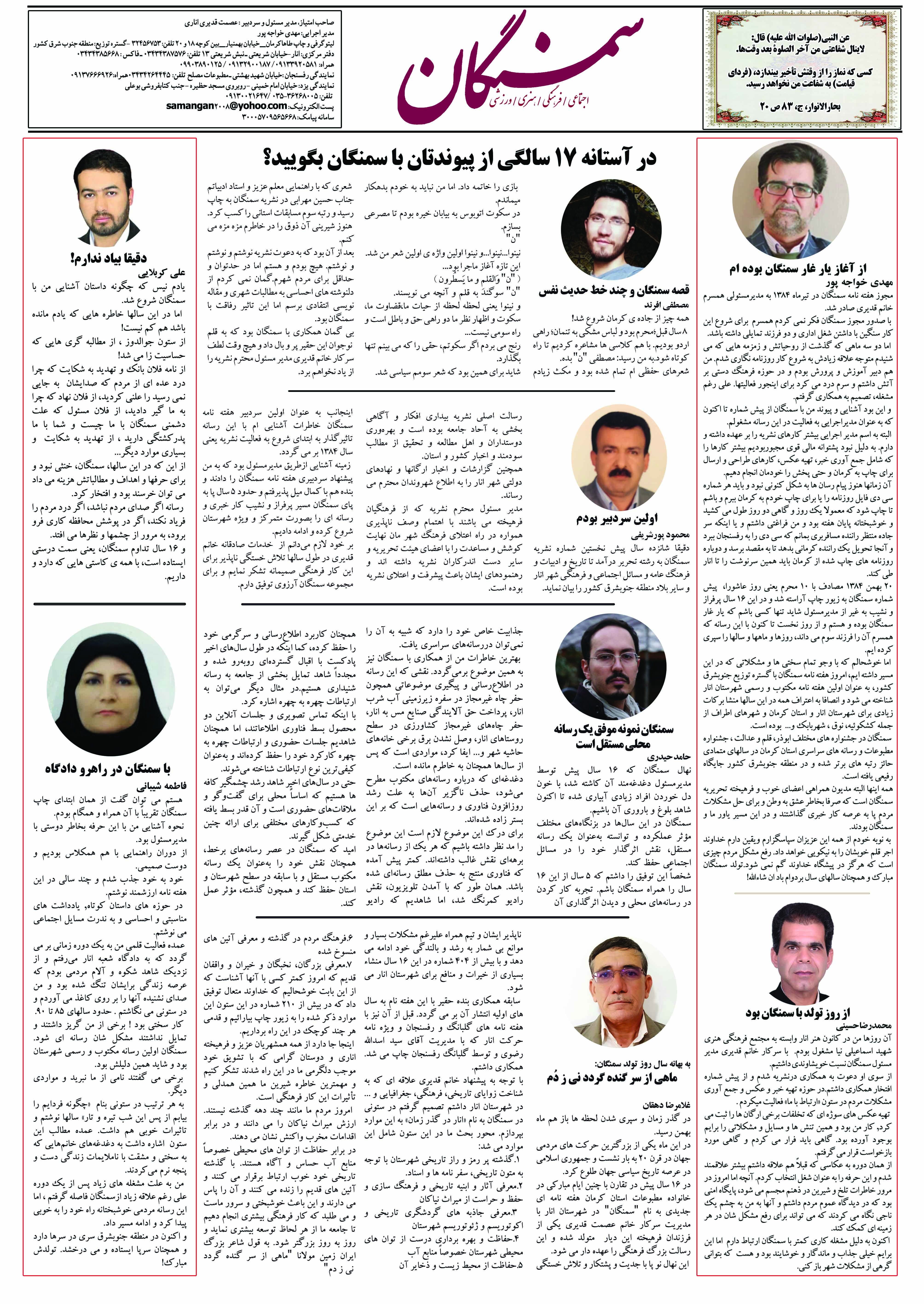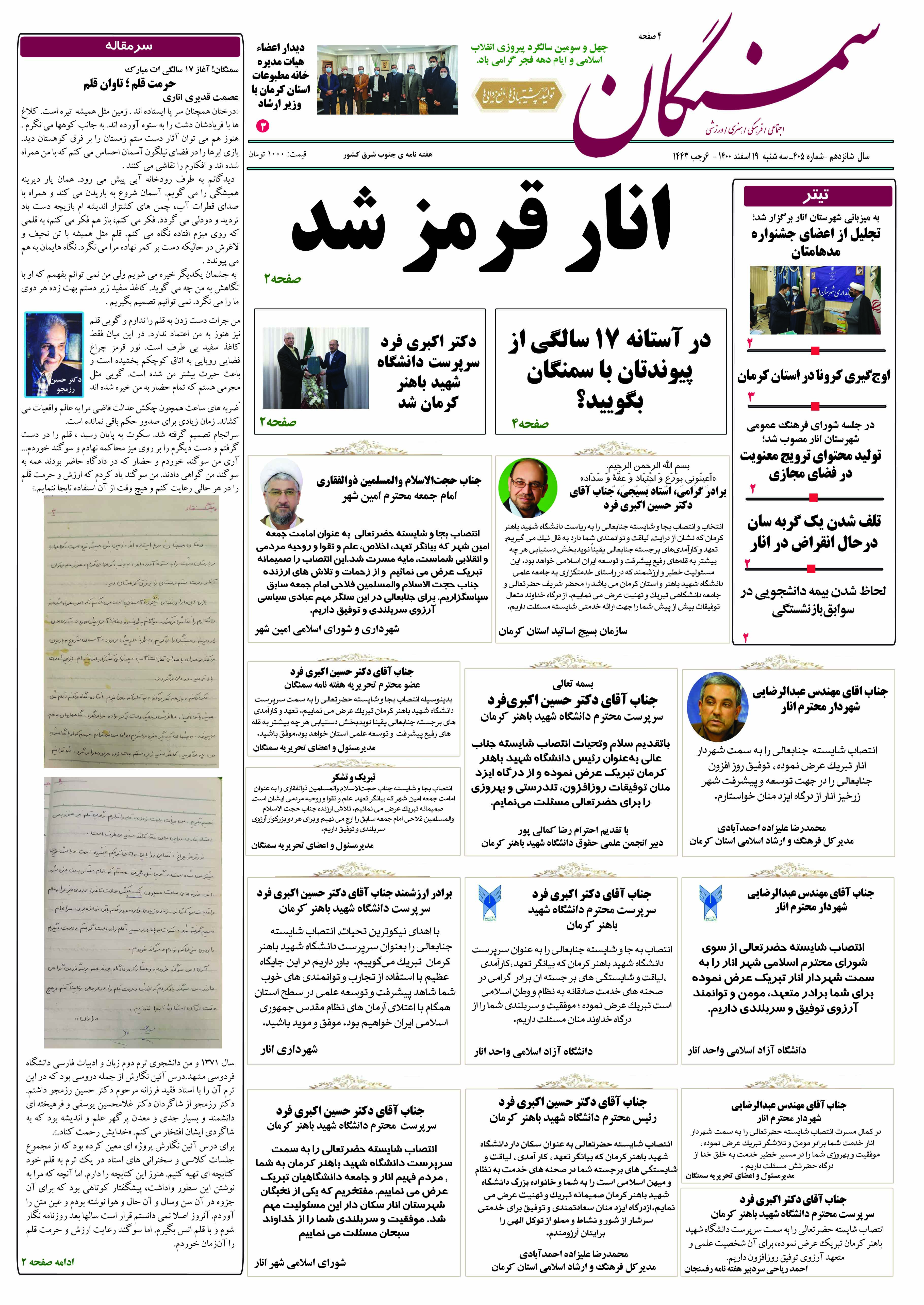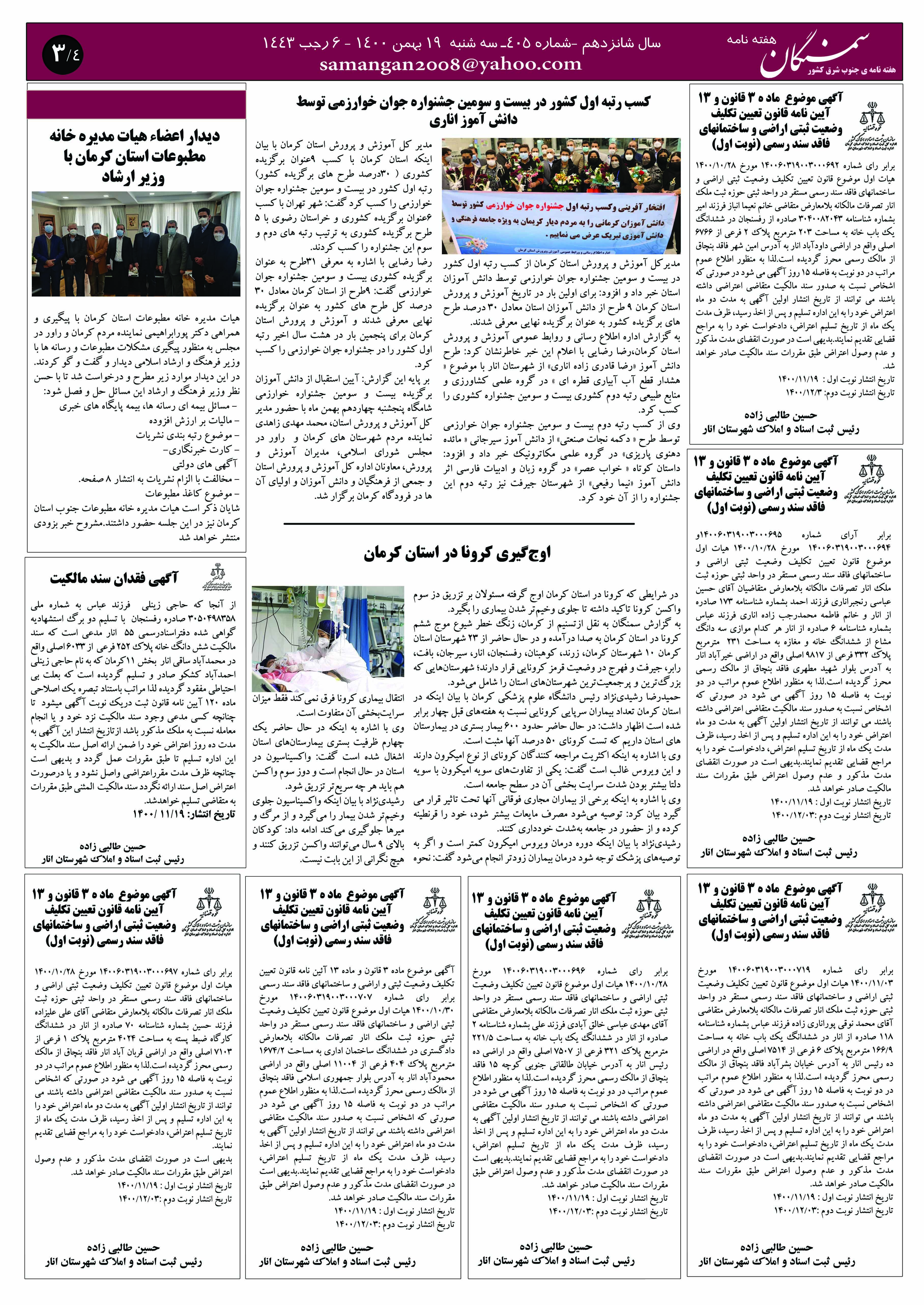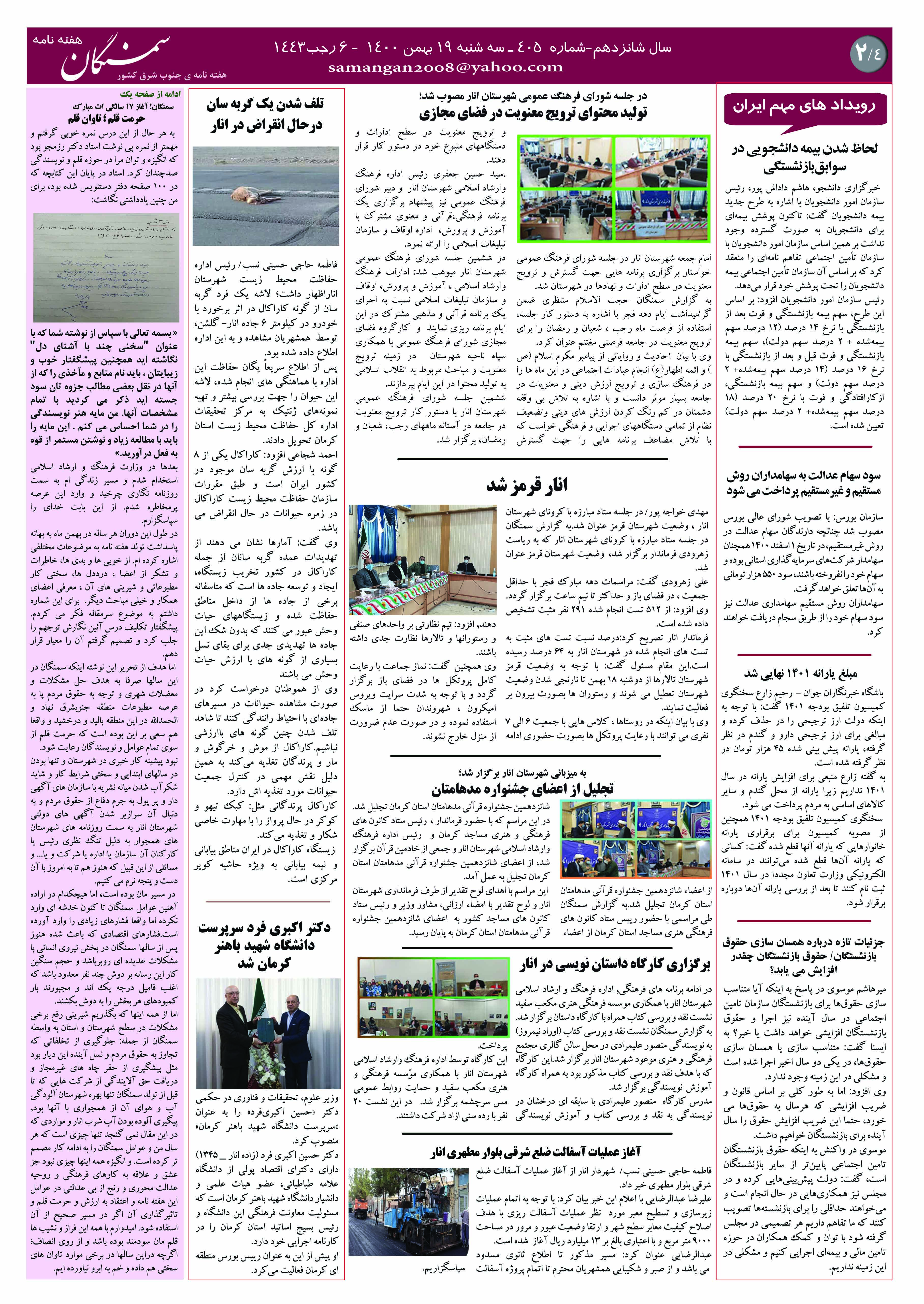 آرشیو سال 1400 آرشیو نشریه سمنگان ۱۹ بهمن ۱۴۰۰۱۶ فروردین ۱۴۰۱ نشریه سمنگان شماره405 توسط :مدیر سایت بدون دیدگاه سمنگان405, نشریه سمنگان برای بهتر خواندن نشریه روی عکسها کلیک کنید.